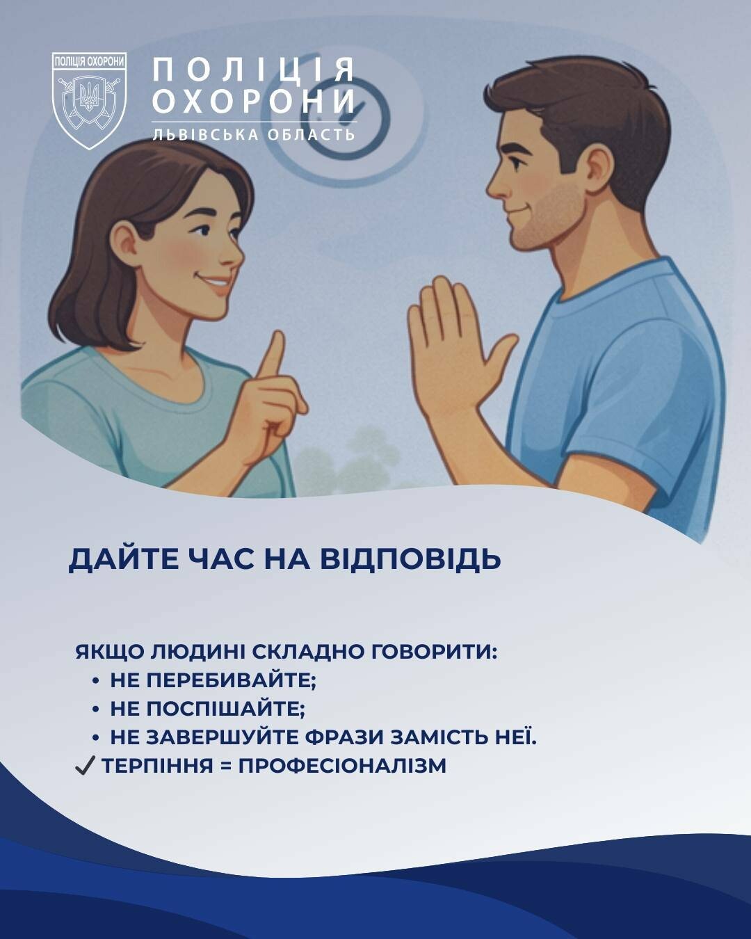 - уважного та терплячого сприйняття повідомлень.